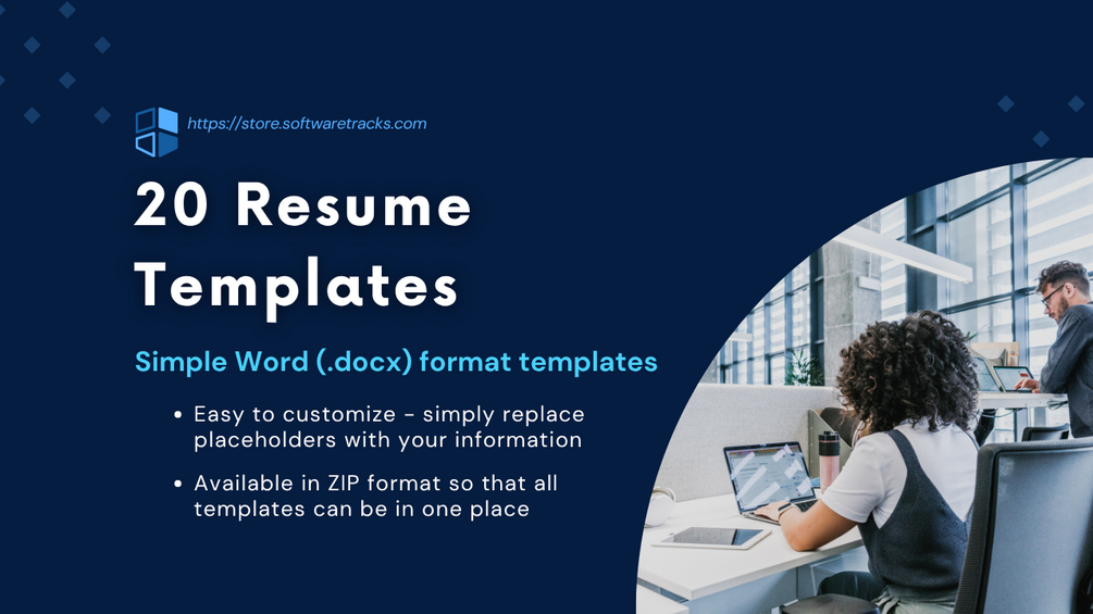 You'll get 20 Resume Templates in Word (.docx) format that you can easily edit by replacing placeholders.